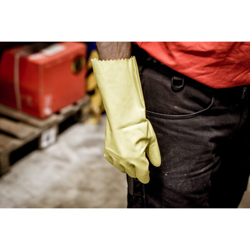 Gospodinjske rokavice NITRAS YELLOW CLEANER zaย zaลกฤito pred kemikalijami, izย lateksa, rumene, dolลพina 30 cm,ย mehko podloลพene,ย zaลกฤita pred mikroorganizmi in bakterijami, za stik s hrano, zarobljen rob za zaลกฤito pred kapljicami s certifikatiย EN 388,EN 420, ISO 374-1:2016-Type A in ISO 374-5:2016