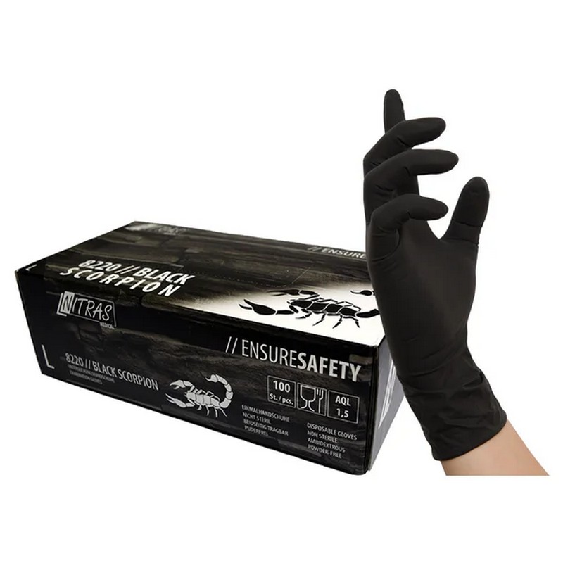 Lateks rokavice Nitras Black Scorpion, črne, za enkratno uporabo, ne-sterilne, zavihan rob, ne pudrane, narejene v skladu z EN 455, EN 374-1 ter EN 374-5, nosljive na obeh rokah, rokavice za medicinske preglede ali uporabo v tatoo studijih, super oprijem, mikro hrapave blazinice prstov, AQL 1,5.