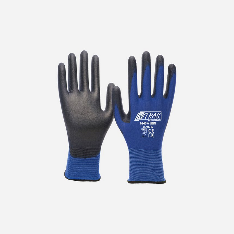 NITRAS SKIN nylon modre rokavice, poliuretanski črn nanos na dlani in konicah prstov, pleteno zapestje, prijetno udobje nošenja, visoka gibljivost, 18 kratno zelo gosto pletenje, odlično prileganje na roko, omogočajo uporabo na zaslonih na dotik.